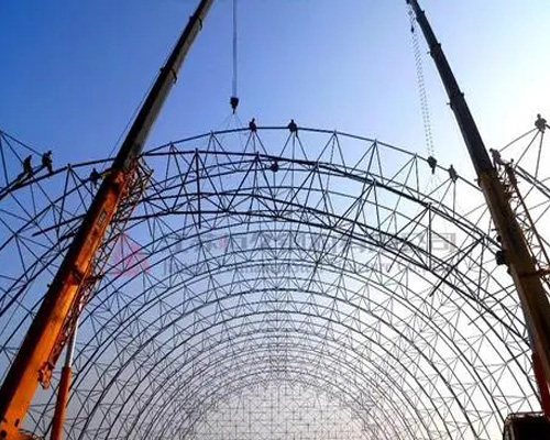 优点六、跨距大、进深大。球形网架的跨距可(kě)以超过30~150m,进深20~30m。一些大容量、大进深的工程建筑,如运动场馆、工业厂房、高铁站、机场、机库、干煤棚、砂石场、高速收费站、加气站,球形网架结构是性价比非常高的挑选。